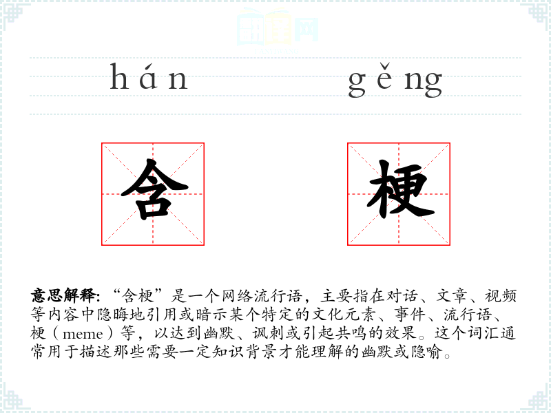 “含梗”一词源自网络文化,特别是社交媒体和论坛,随着网络文化的兴起而逐渐流行。它结合了“含”(包含、隐含)和“梗”(网络流行语、文化元素)两个词,形成了一个新的表达方式。