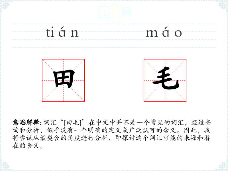 词汇“[田毛]”在中文中并不是一个常见的词汇,经过查询和分析,似乎没有一个明确的定义或广泛认可的含义。因此,我将尝试从最契合的角度进行分析,即探讨这个词汇可能的来源和潜在的含义。