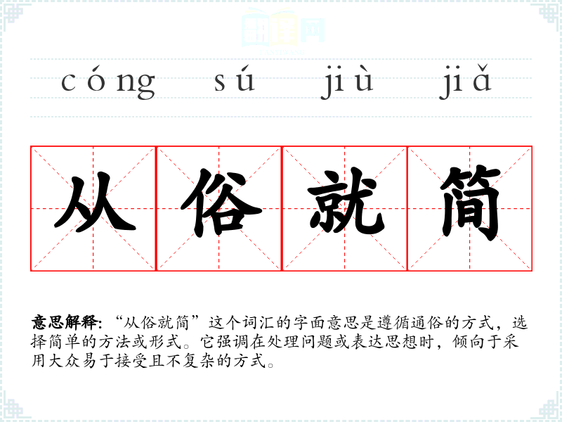 “从俗就简”这个词汇的字面意思是遵循通俗的方式,选择简单的方法或形式。它强调在处理问题或表达思想时,倾向于采用大众易于接受且不复杂的方式。