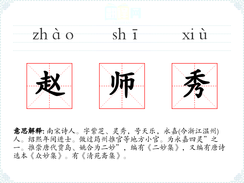 南宋诗人。字紫芝、灵秀,号天乐,永嘉(今浙江温州)人。绍熙年间进士。做过筠州推官等地方小官。为永嘉四灵”之一。推崇唐代贾岛、姚合为二妙”,编有《二妙集》,又编有唐诗选本《众妙集》。有《清苑斋集》。