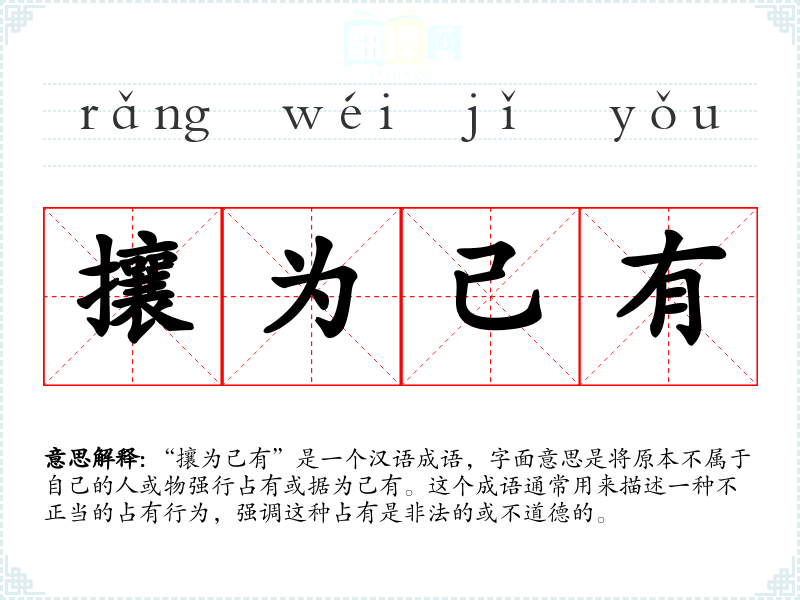 “攘为己有”这个成语源自古代汉语,其中“攘”字原意为排斥、抵御,后来引申为夺取、占有。这个成语的历史悠久,反映了古代社会对财产权的重视和保护。