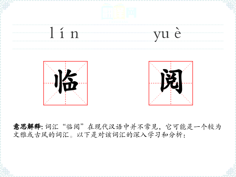 词汇“临阅”在现代汉语中并不常见,它可能是一个较为文雅或古风的词汇。以下是对该词汇的深入学*和分析: