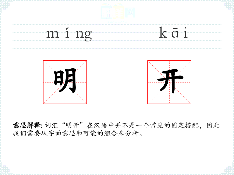 词汇“明开”在汉语中并不是一个常见的固定搭配,因此我们需要从字面意思和可能的组合来分析。