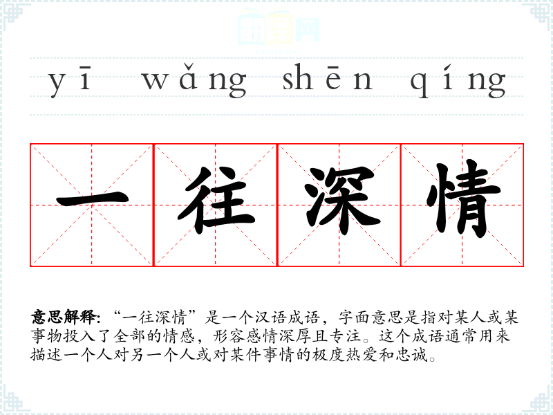 “一往深情”是一个汉语成语,字面意思是指对某人或某事物投入了全部的情感,形容感情深厚且专注。这个成语通常用来描述一个人对另一个人或对某件事情的极度热爱和忠诚。