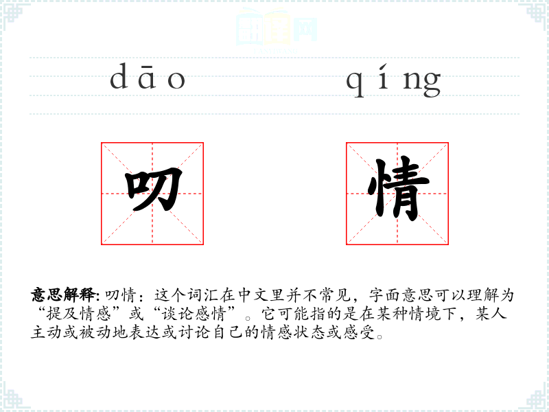 叨情:这个词汇在中文里并不常见,字面意思可以理解为“提及情感”或“谈论感情”。它可能指的是在某种情境下,某人主动或被动地表达或讨论自己的情感状态或感受。