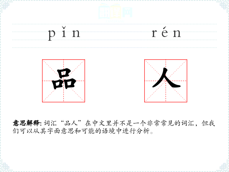词汇“品人”在中文里并不是一个非常常见的词汇,但我们可以从其字面意思和可能的语境中进行分析。