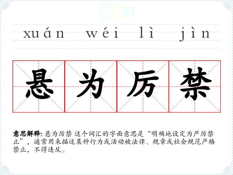 悬为厉禁 这个词汇的字面意思是“明确地设定为严厉禁止”,通常用来描述某种行为或活动被法律、规章或社会规范严格禁止,不得违反。
