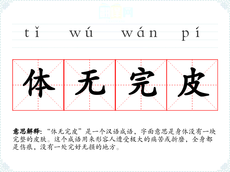 “体无完皮”是一个汉语成语,字面意思是身体没有一块完整的皮肤。这个成语用来形容人遭受极大的痛苦或折磨,全身都是伤痕,没有一处完好无损的地方。