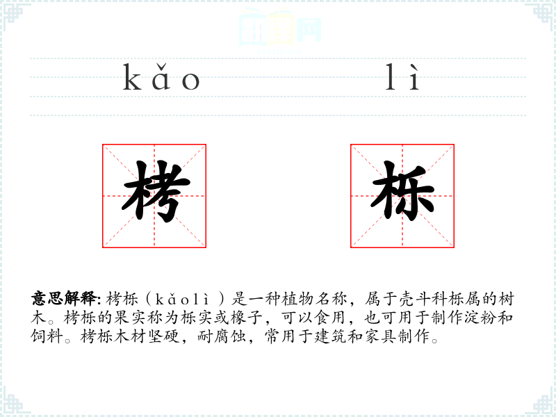 - 反义词:软木(ruǎn mù)- 与栲栎的硬木特性相对,软木来自软木栎(Quercus suber),质地较软。