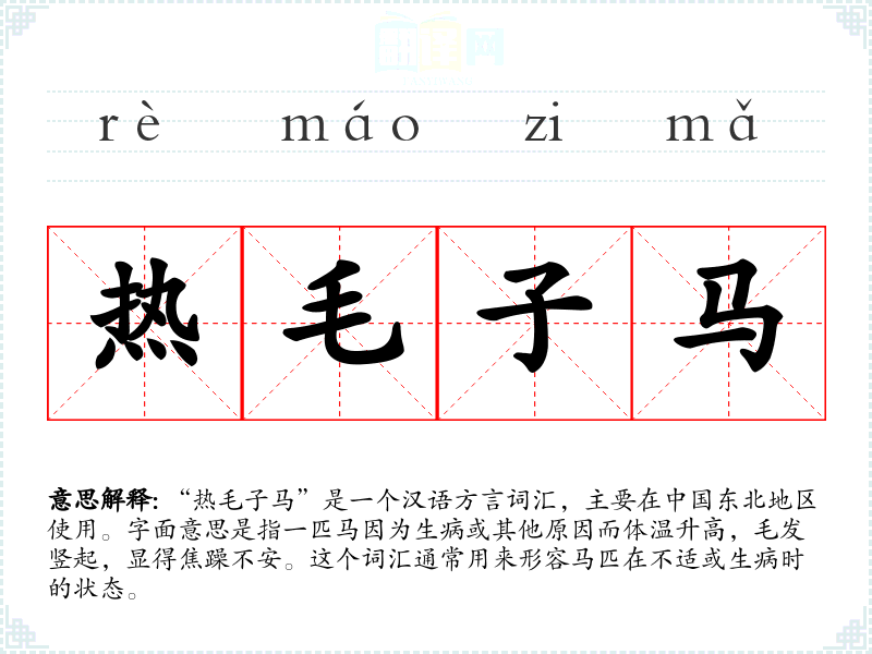 “热毛子马”是一个汉语方言词汇,主要在**东北地区使用。字面意思是指一匹马因为生病或其他原因而体温升高,毛发竖起,显得焦躁不安。这个词汇通常用来形容马匹在不适或生病时的状态。