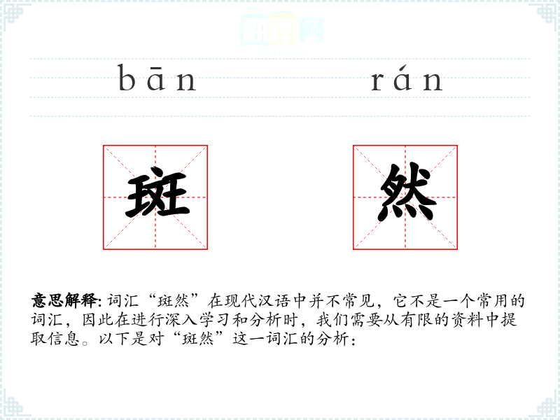 词汇“斑然”在现代汉语中并不常见,它不是一个常用的词汇,因此在进行深入学习和分析时,我们需要从有限的资料中提取信息。以下是对“斑然”这一词汇的分析: