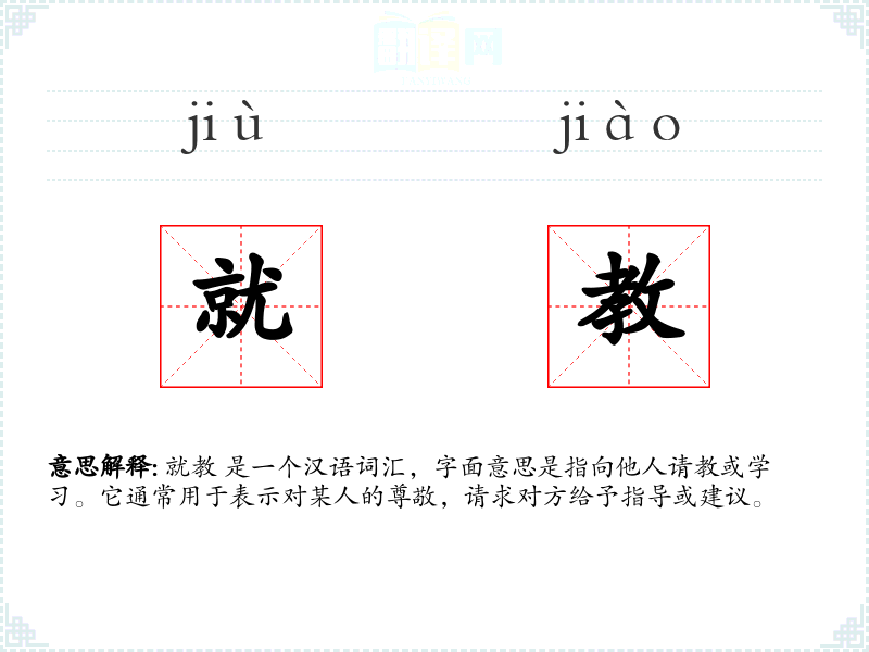 就教 是一个汉语词汇,字面意思是指向他人请教或学*。它通常用于表示对某人的尊敬,请求对方给予指导或建议。