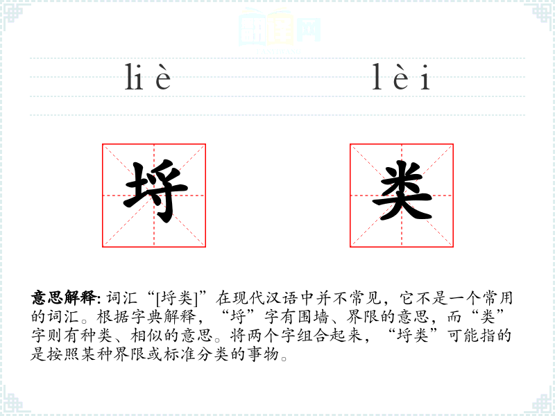 - 词源:“埒”字源自古代的围墙,用于划分界限;“类”字源自对事物的相似性进行归类。