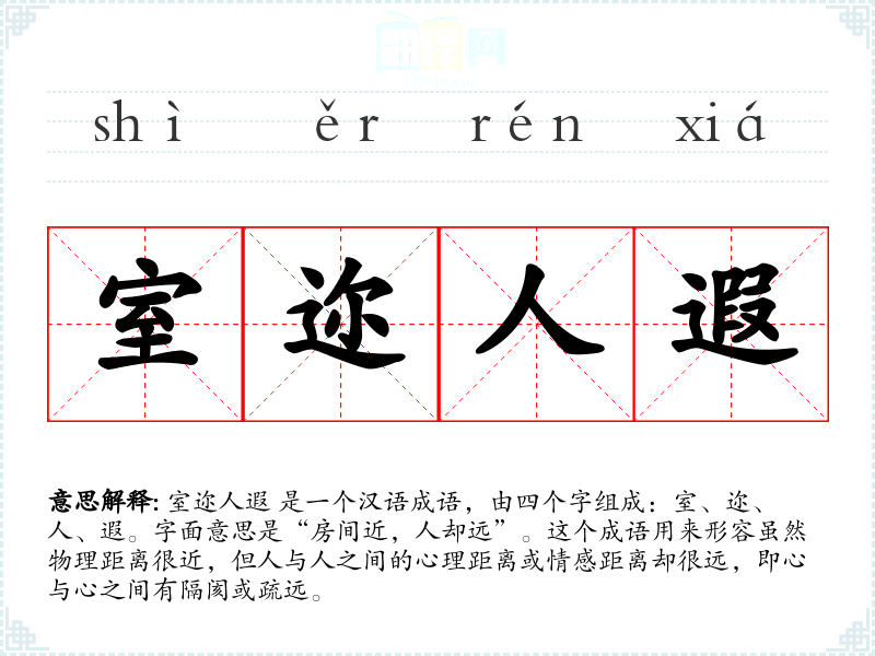 室迩人遐 是一个汉语成语,由四个字组成:室、迩、人、遐。字面意思是“房间近,人却远”。这个成语用来形容虽然物理距离很近,但人与人之间的心理距离或情感距离却很远,即心与心之间有隔阂或疏远。