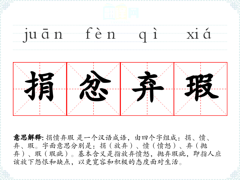 捐愤弃瑕 是一个汉语成语,由四个字组成:捐、愤、弃、瑕。字面意思分别是:捐(放弃)、愤(愤怒)、弃(抛弃)、瑕(瑕疵)。基本含义是指放弃愤怒,抛弃瑕疵,即指人应该放下怨恨和缺点,以更宽容和积极的态度面对生活。