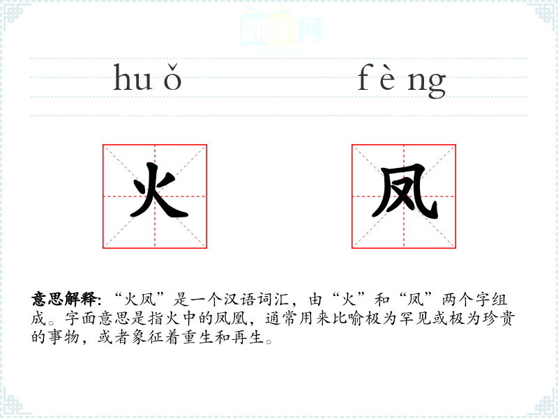 “火凤”是一个汉语词汇,由“火”和“凤”两个字组成。字面意思是指火中的凤凰,通常用来比喻极为罕见或极为珍贵的事物,或者象征着重生和再生。