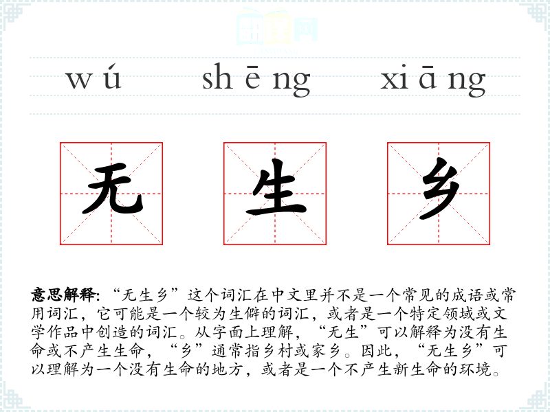 “无生乡”这个词汇在中文里并不是一个常见的成语或常用词汇,它可能是一个较为生僻的词汇,或者是一个特定领域或文学作品中创造的词汇。从字面上理解,“无生”可以解释为没有生命或不产生生命,“乡”通常指乡村或家乡。因此,“无生乡”可以理解为一个没有生命的地方,或者是一个不产生新生命的环境。