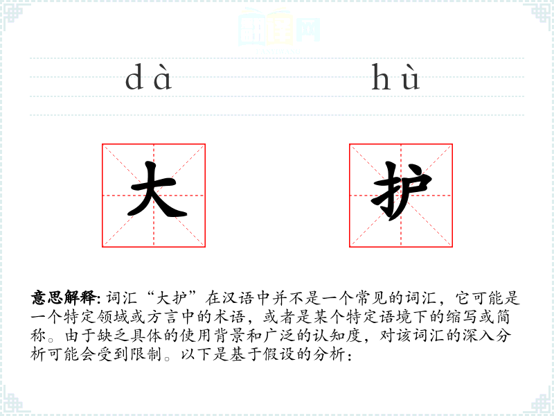 词汇“大护”在汉语中并不是一个常见的词汇,它可能是一个特定领域或方言中的术语,或者是某个特定语境下的缩写或简称。由于缺乏具体的使用背景和广泛的认知度,对该词汇的深入分析可能会受到限制。以下是基于假设的分析: