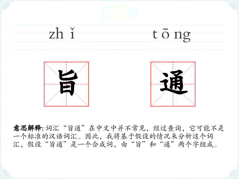 词汇“旨通”在中文中并不常见,经过查询,它可能不是一个标准的汉语词汇。因此,我将基于假设的情况来分析这个词汇,假设“旨通”是一个合成词,由“旨”和“通”两个字组成。