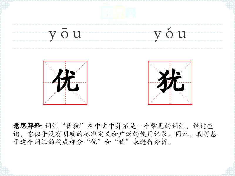 - 犹:可以指仍然、还,或者指某种动物(如猶),但在“优犹”中可能没有实际意义,或者可能是误用。