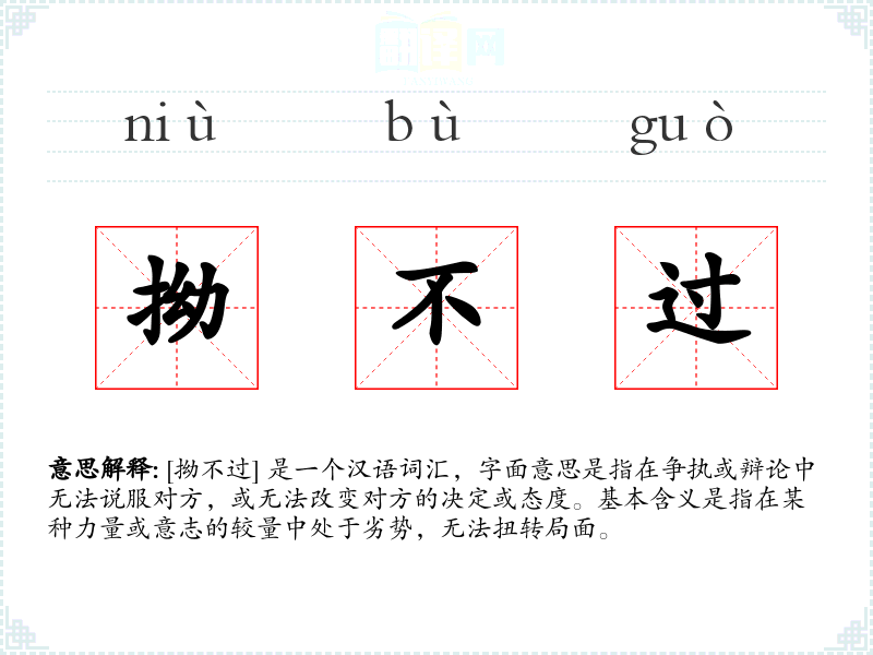 [拗不过] 是一个汉语词汇,字面意思是指在争执或辩论中无法说服对方,或无法改变对方的决定或态度。基本含义是指在某种力量或意志的较量中处于劣势,无法扭转局面。