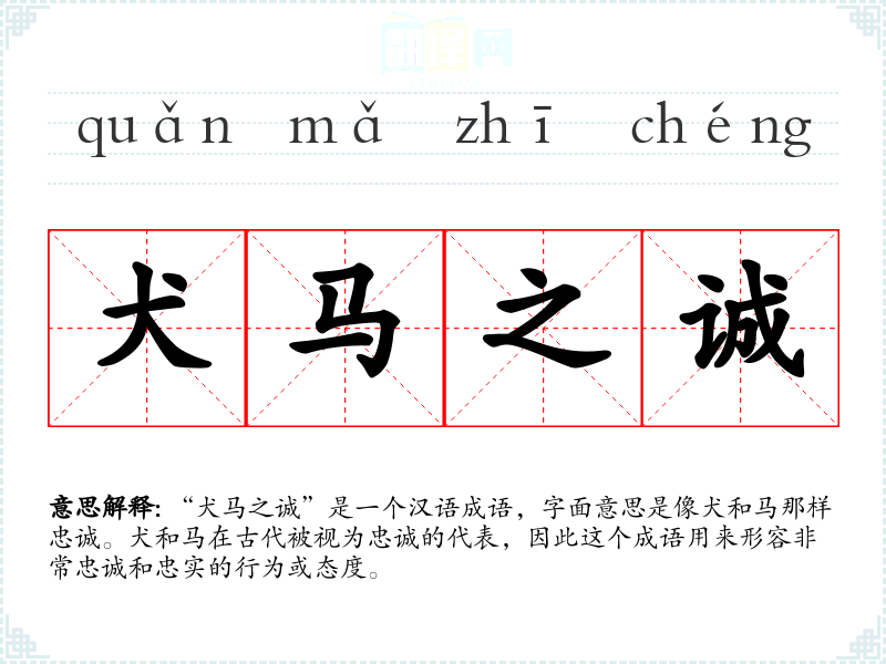 “犬马之诚”是一个汉语成语,字面意思是像犬和马那样忠诚。犬和马在古代被视为忠诚的代表,因此这个成语用来形容非常忠诚和忠实的行为或态度。
