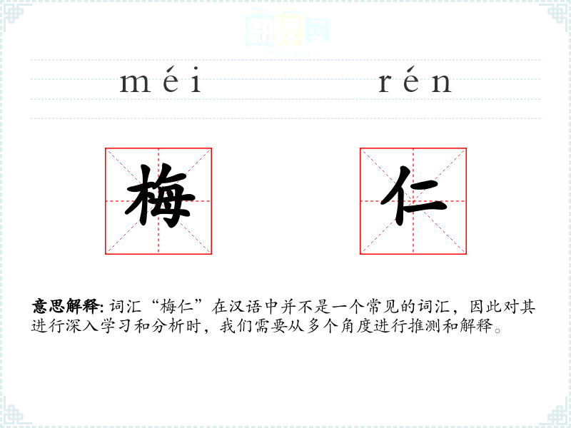 词汇“梅仁”在汉语中并不是一个常见的词汇,因此对其进行深入学*和分析时,我们需要从多个角度进行推测和解释。