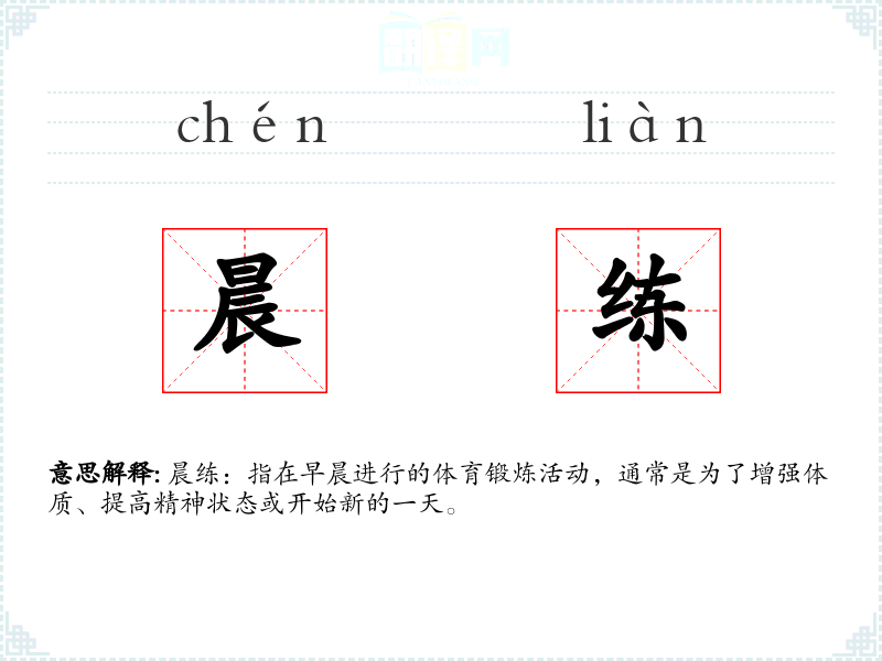 晨练一词由“晨”和“练”组成,“晨”指早晨,“练”指练*或锻炼。这个词在中文中的使用历史较长,随着人们对健康生活的重视,其使用频率逐渐增加。