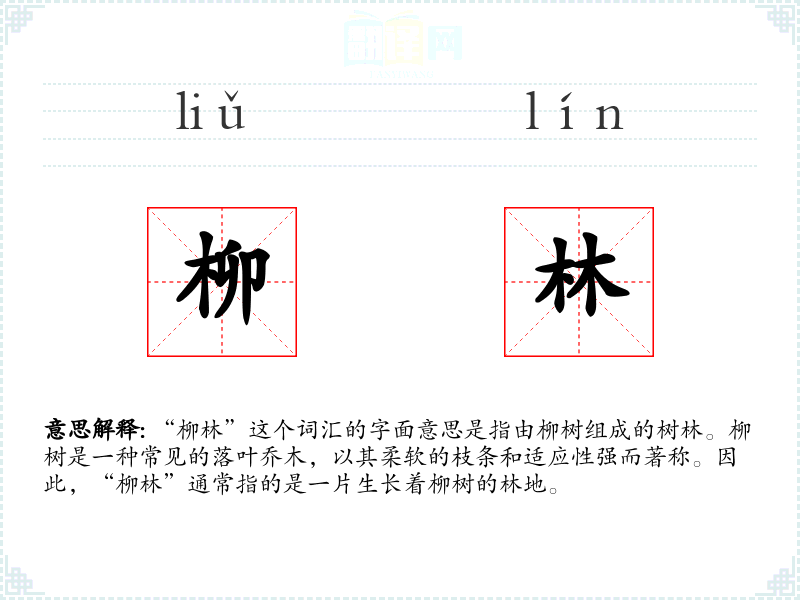 在不同语言中,“柳林”可能没有直接对应的词汇,但类似的自然景观描述词汇在各种语言中都有。例如,在英语中,可能会用“willow grove”或“willow forest”来描述类似的景象。