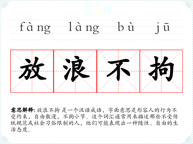 放浪不拘 是一个汉语成语,字面意思是形容人的行为不受约束,自由散漫,不拘小节。这个词汇通常用来描述那些不受传统规范或社会*俗限制的人,他们可能表现出一种随性、自由的生活态度。