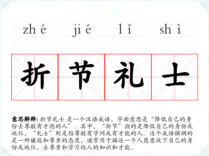 折节礼士 是一个汉语成语,字面意思是“降低自己的身份去尊敬有才德的人”。其中,“折节”指的是降低自己的身份或地位,“礼士”则是指尊敬有学问或有才能的人。这个成语强调的是一种谦逊和尊重的态度,通常用于描述一个人愿意放下自己的身份或地位,去尊重和学*他人的知识和才能。