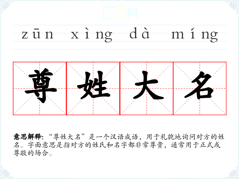 “尊姓大名”是一个汉语成语,用于礼貌地询问对方的姓名。字面意思是指对方的姓氏和名字都非常尊贵,通常用于正式或尊敬的场合。