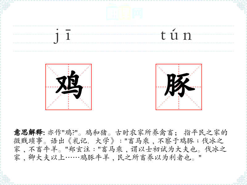 1.亦作"鸡?"。鸡和猪。古时农家所养禽畜; 指平民之家的微贱琐事。语出《礼记.大学》﹕"畜马乘﹐不察于鸡豚﹔伐冰之家﹐不畜牛羊。"郑玄注﹕"畜马乘﹐谓以士初试为大夫也。伐冰之家﹐卿大夫以上……鸡豚牛羊﹐民之所畜养以为利者也。"
