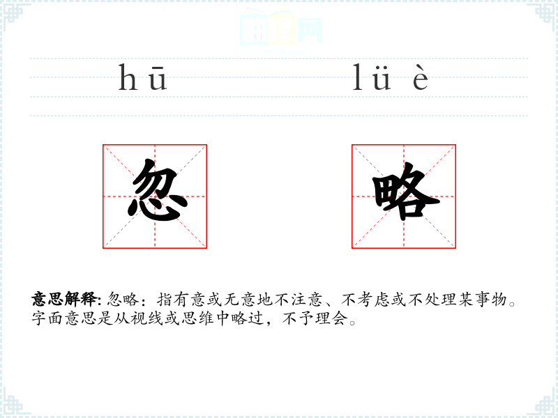 忽略:指有意或无意地不注意、不考虑或不处理某事物。字面意思是从视线或思维中略过,不予理会。