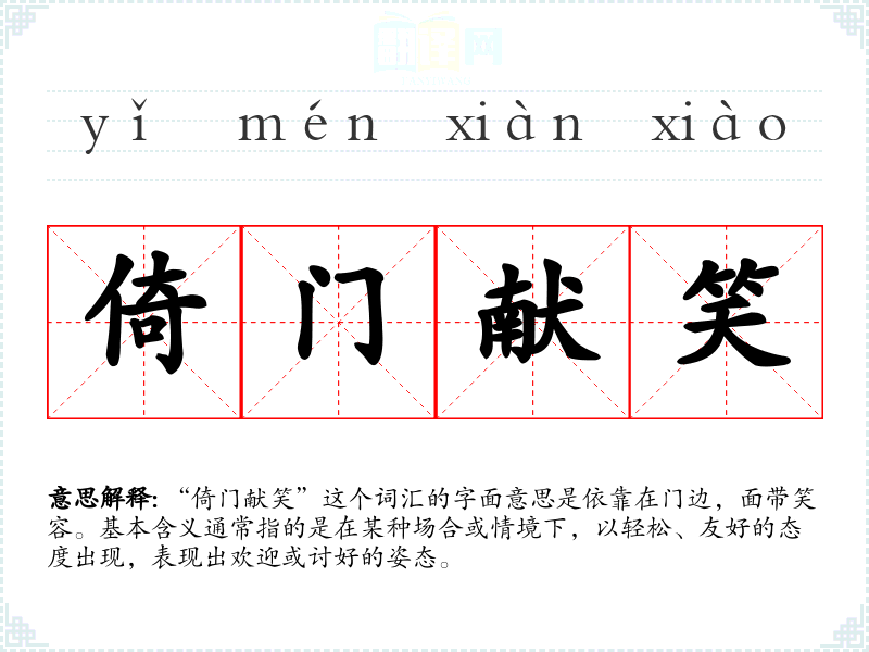 “倚门献笑”这个词汇的字面意思是依靠在门边,面带笑容。基本含义通常指的是在某种场合或情境下,以轻松、友好的态度出现,表现出欢迎或讨好的姿态。