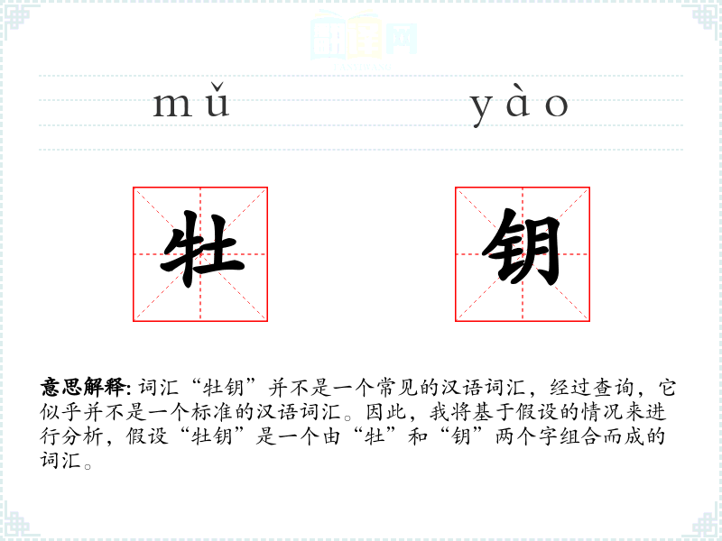 词汇“牡钥”并不是一个常见的汉语词汇,经过查询,它似乎并不是一个标准的汉语词汇。因此,我将基于假设的情况来进行分析,假设“牡钥”是一个由“牡”和“钥”两个字组合而成的词汇。