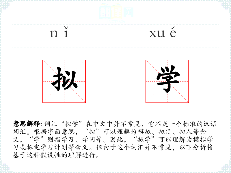 词汇“拟学”在中文中并不常见,它不是一个标准的汉语词汇。根据字面意思,“拟”可以理解为模拟、拟定、拟人等含义,“学”则指学习、学问等。因此,“拟学”可以理解为模拟学习或拟定学习计划等含义。但由于这个词汇并不常见,以下分析将基于这种假设性的理解进行。