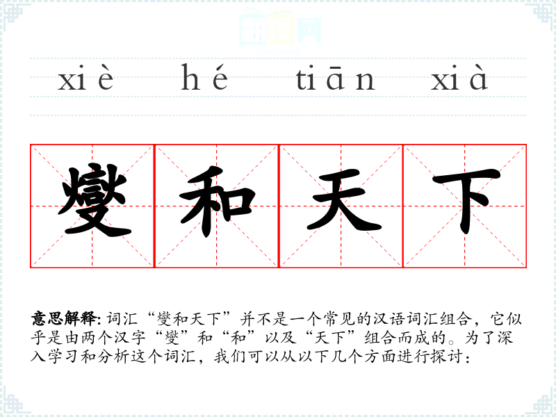 词汇“燮和天下”并不是一个常见的汉语词汇组合,它似乎是由两个汉字“燮”和“和”以及“天下”组合而成的。为了深入学*和分析这个词汇,我们可以从以下几个方面进行探讨:
