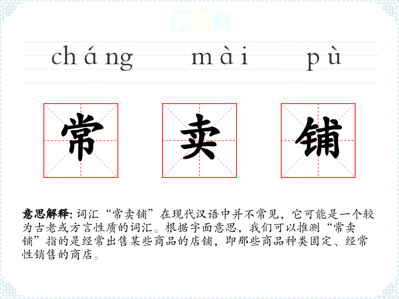 词汇“常卖铺”在现代汉语中并不常见,它可能是一个较为古老或方言性质的词汇。根据字面意思,我们可以推测“常卖铺”指的是经常出售某些商品的店铺,即那些商品种类固定、经常性销售的商店。
