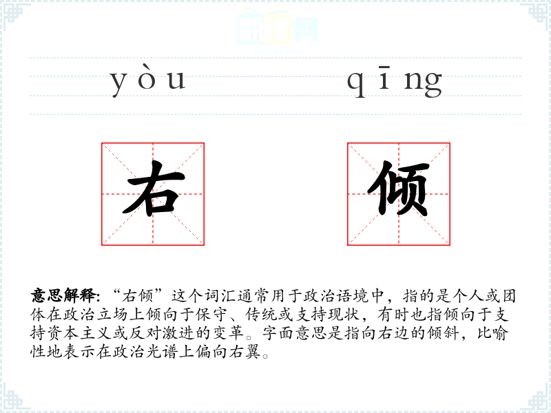“右倾”这个词汇通常用于政治语境中,指的是个人或团体在政治立场上倾向于保守、传统或支持现状,有时也指倾向于支持资本主义或反对激进的变革。字面意思是指向右边的倾斜,比喻性地表示在政治光谱上偏向右翼。