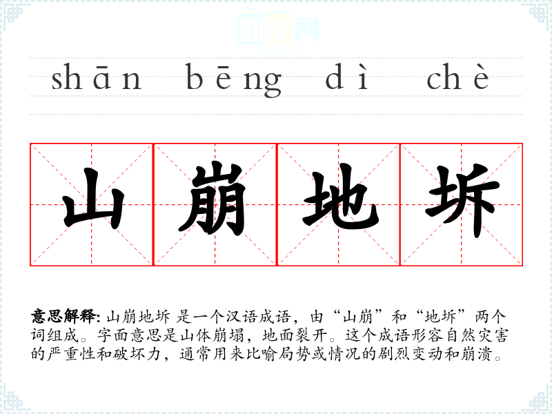 山崩地坼 是一个汉语成语,由“山崩”和“地坼”两个词组成。字面意思是山体崩塌,地面裂开。这个成语形容自然灾害的严重性和破坏力,通常用来比喻局势或情况的剧烈变动和崩溃。