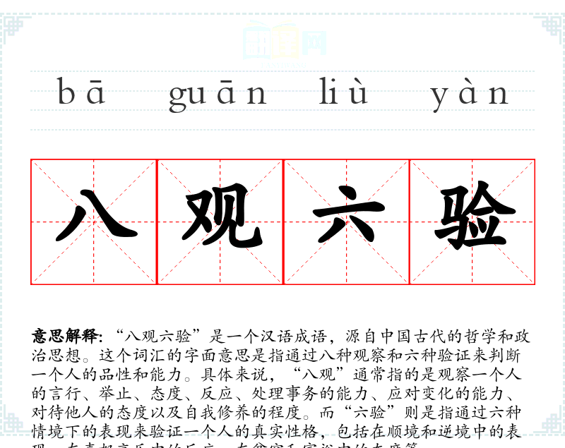 “八观六验”是一个汉语成语,源自中国古代的哲学和政治思想。这个词汇的字面意思是指通过八种观察和六种验证来判断一个人的品性和能力。具体来说,“八观”通常指的是观察一个人的言行、举止、态度、反应、处理事务的能力、应对变化的能力、对待他人的态度以及自我修养的程度。而“六验”则是指通过六种情境下的表现来验证一个人的真实性格,包括在顺境和逆境中的表现、在喜怒哀乐中的反应、在贫穷和富裕中的态度等。