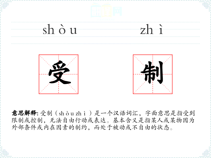 受制(shòu zhì)是一个汉语词汇,字面意思是指受到限制或控制,无法自由行动或表达。基本含义是指某人或某物因为外部条件或内在因素的制约,而处于被动或不自由的状态。