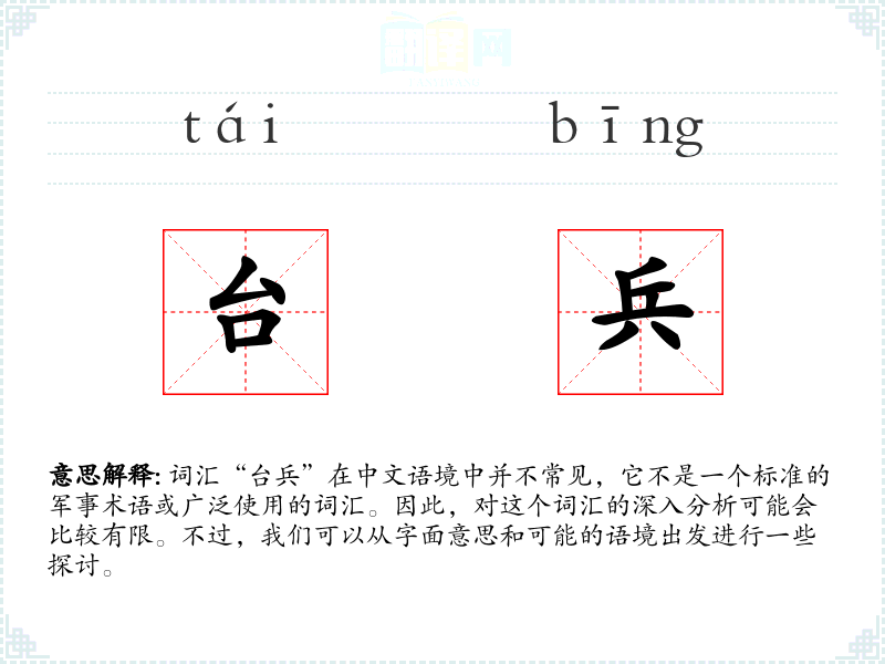 词汇“台兵”在中文语境中并不常见,它不是一个标准的军事术语或广泛使用的词汇。因此,对这个词汇的深入分析可能会比较有限。不过,我们可以从字面意思和可能的语境出发进行一些探讨。