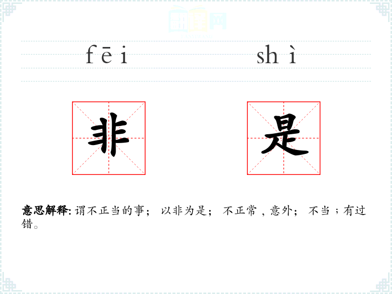 谓不正当的事; 以非为是; 不正常﹐意外; 不当﹔有过错。