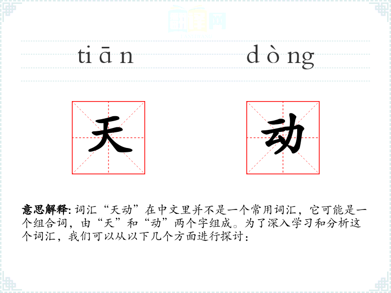 词汇“天动”在中文里并不是一个常用词汇,它可能是一个组合词,由“天”和“动”两个字组成。为了深入学*和分析这个词汇,我们可以从以下几个方面进行探讨: