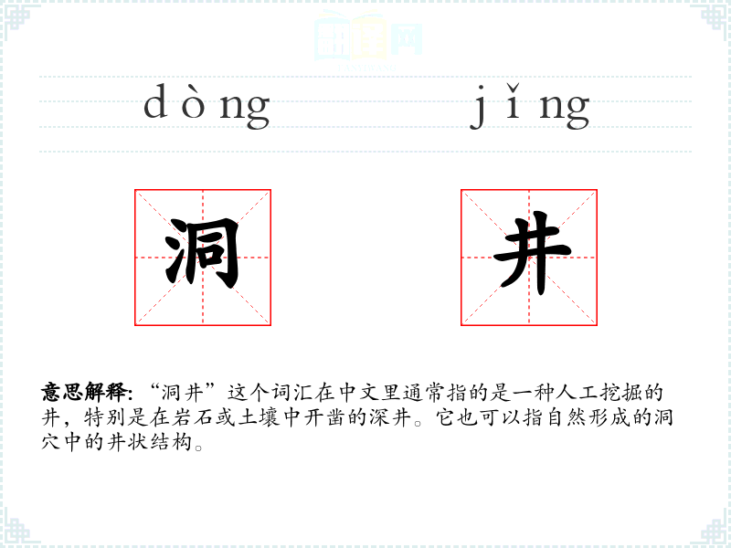 在英语中,类似的词汇可能是“well”或“shaft”,但它们的使用和文化含义可能与中文中的“洞井”有所不同。