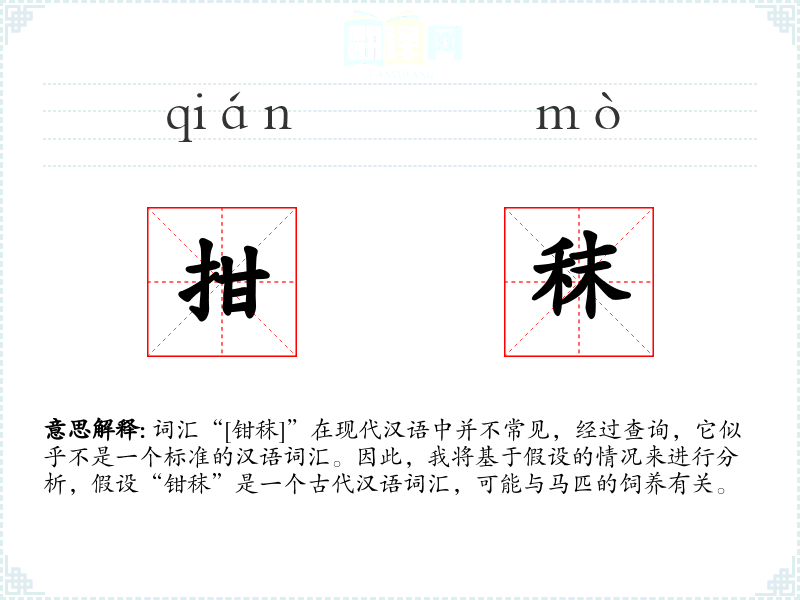 词汇“[钳秣]”在现代汉语中并不常见,经过查询,它似乎不是一个标准的汉语词汇。因此,我将基于假设的情况来进行分析,假设“钳秣”是一个古代汉语词汇,可能与马匹的饲养有关。