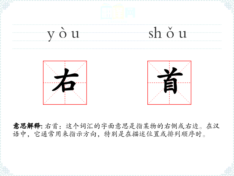 右首:这个词汇的字面意思是指某物的右侧或右边。在汉语中,它通常用来指示方向,特别是在描述位置或排列顺序时。