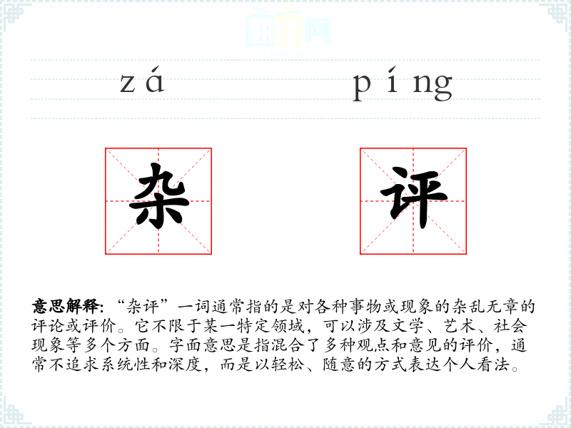 - 文学:在文学评论中,“杂评”可能指对一部作品的多角度、非正式的评论,不拘泥于学术规范,更注重个人感受和直观印象。